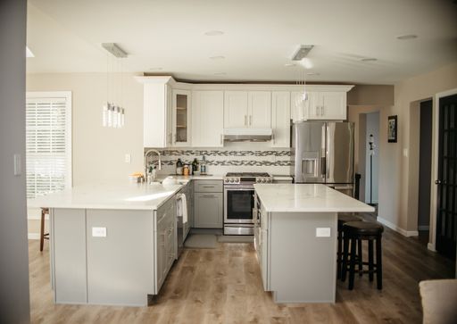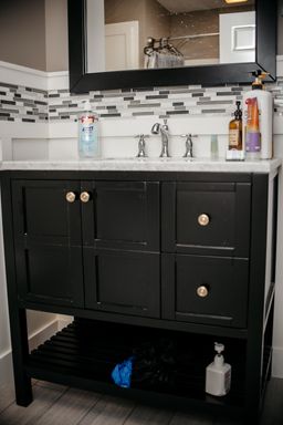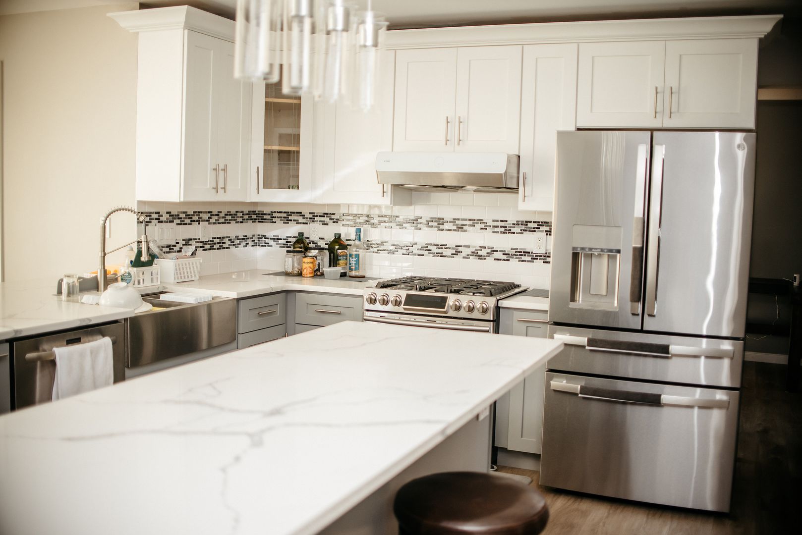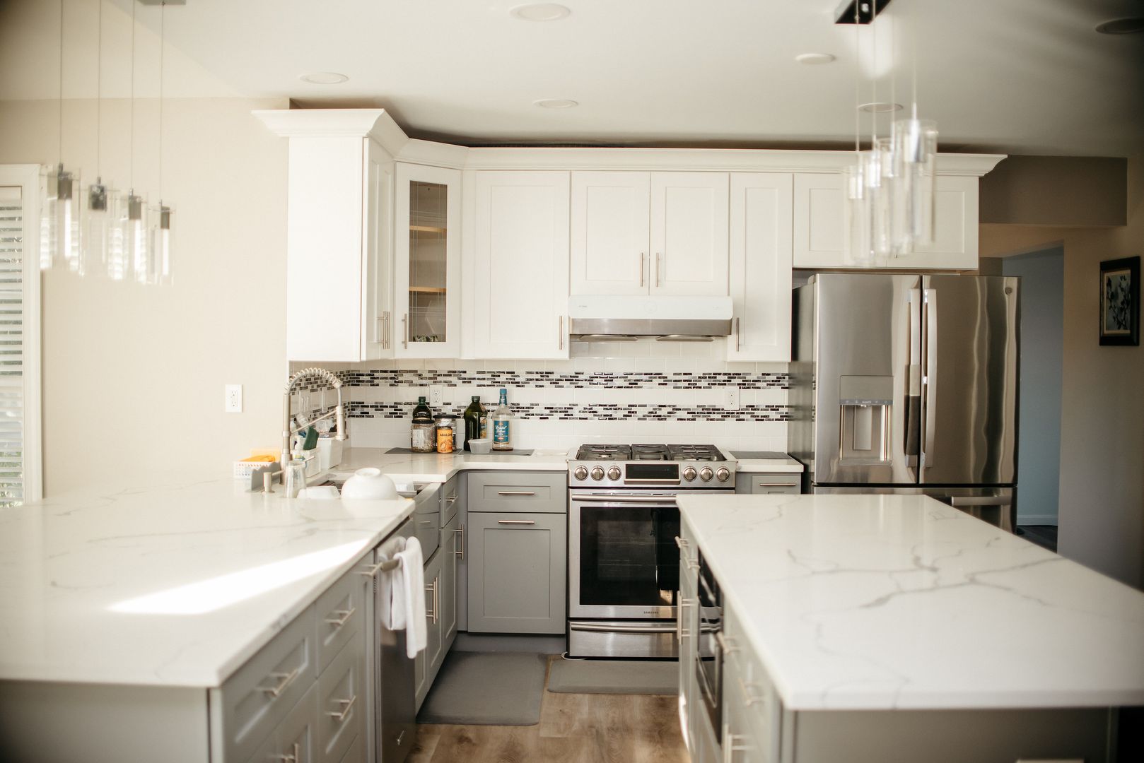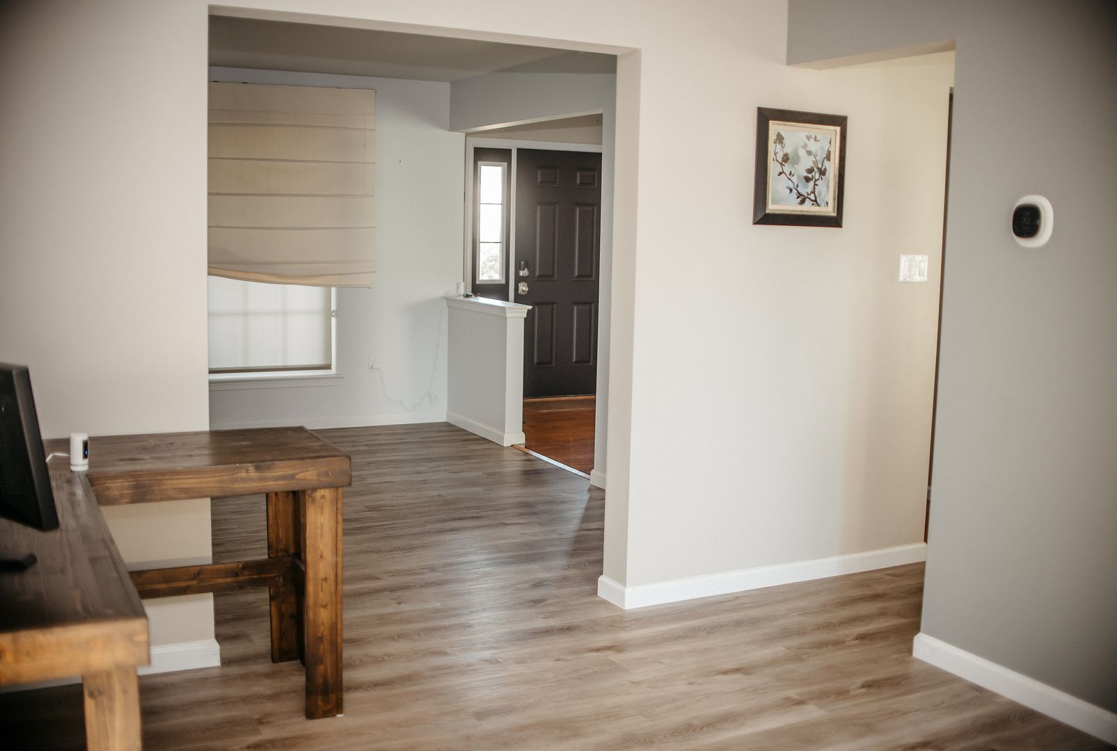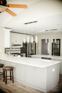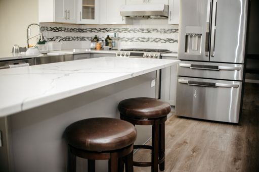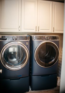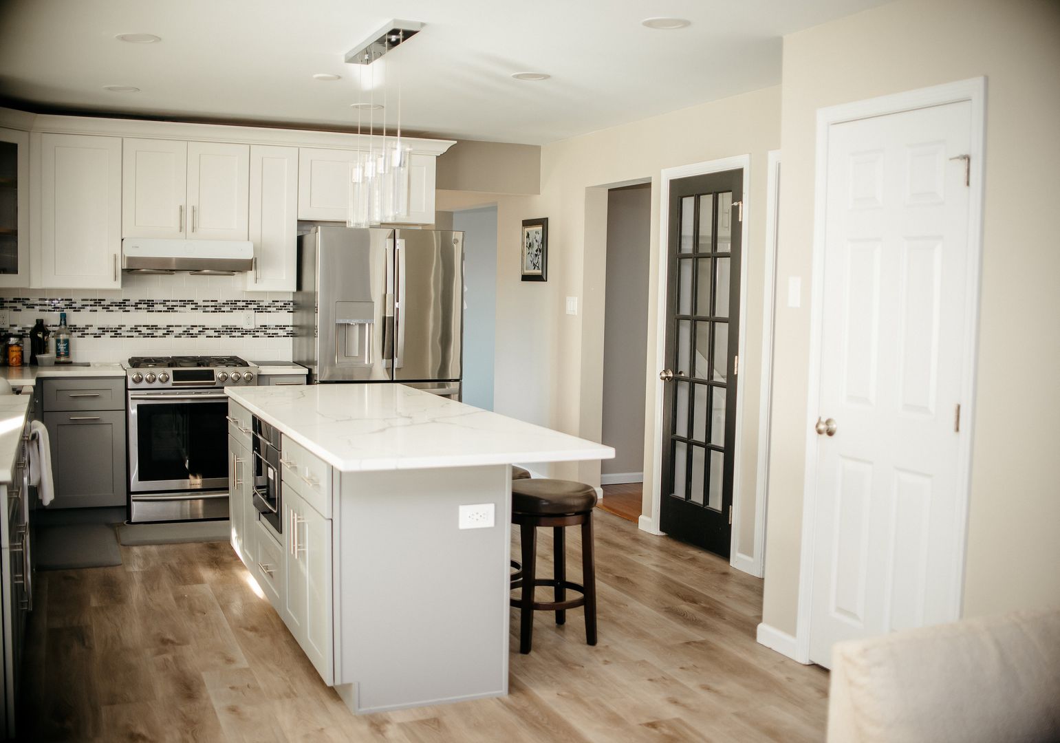 The main level welcomes you with a bright, open floor plan featuring beautiful finishes and modern design elements. The fully remodeled kitchen serves as the centerpiece of the home, boasting high-end stainless steel appliances, sleek cabinetry, and a versatile kitchen island that doubles as a breakfast bar, perfect for morning coffee or casual gatherings. Just off the kitchen, the inviting living room includes a large flat-screen TV that will remain for resident enjoyment, creating a seamless blend of style and convenience. A powder room and first-floor laundry room add practicality to the elegant layout.
